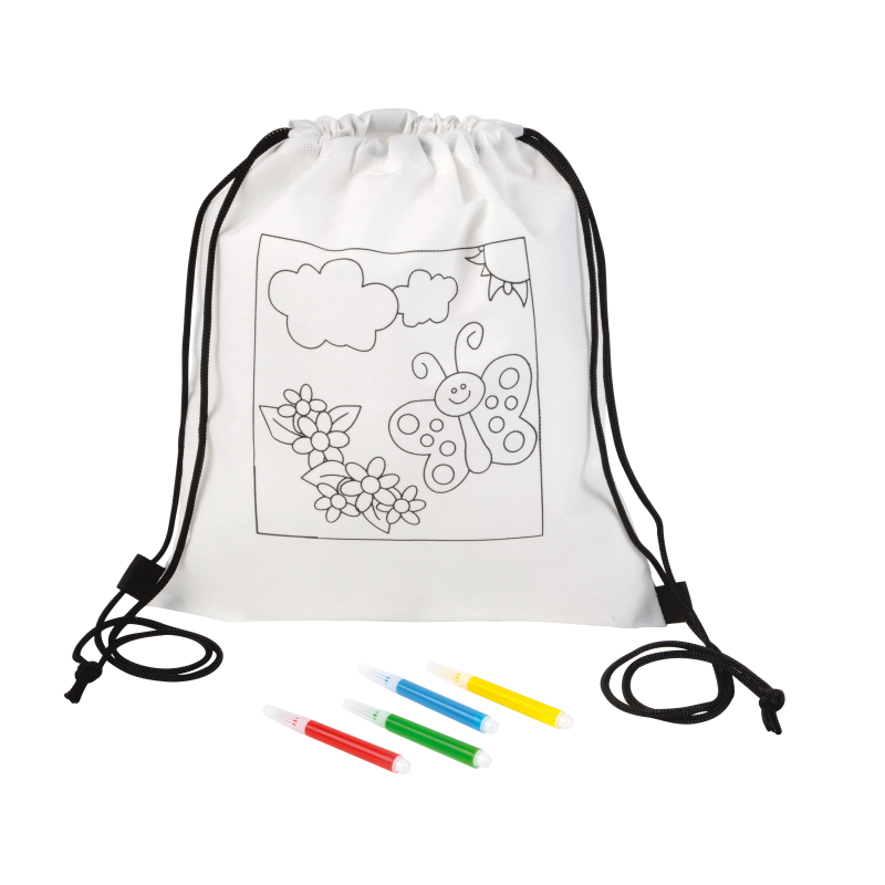 Plecak do kolorowania COLORFUL HOBBY ze sznurkami do przenoszenia, z nadrukowanym rysunkiem i 4 pisakami przeznaczonymi do kolorowania. Produkt non-woven.